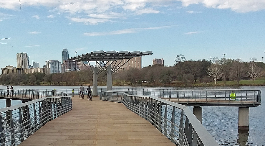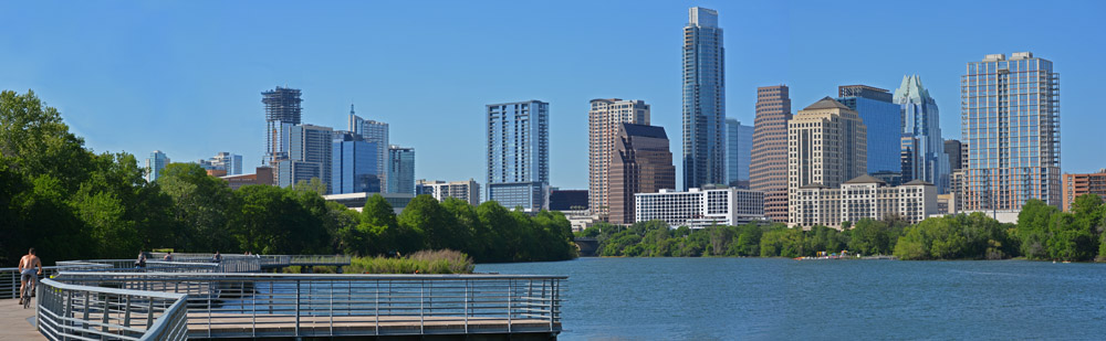 Look north as you walk along the boardwalk on Lady Bird Lake, and you'll see a modern city.