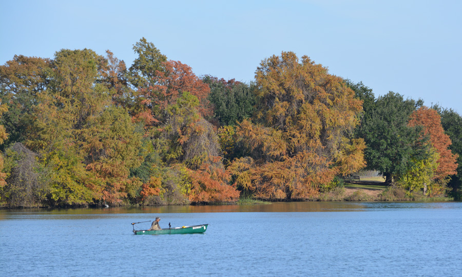 Lady Bird Lake on a calm fall day. An electric motor powers the fisherman's canoe. The city prohibits gas-powered engines on Lady Bird.