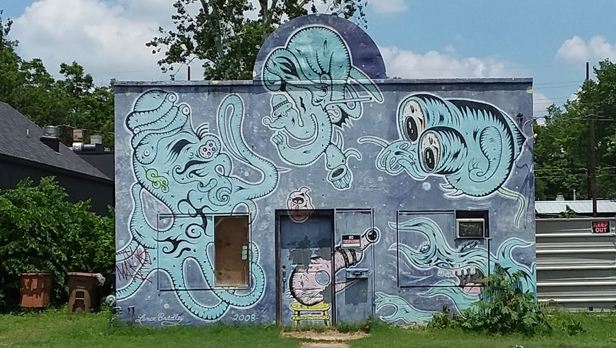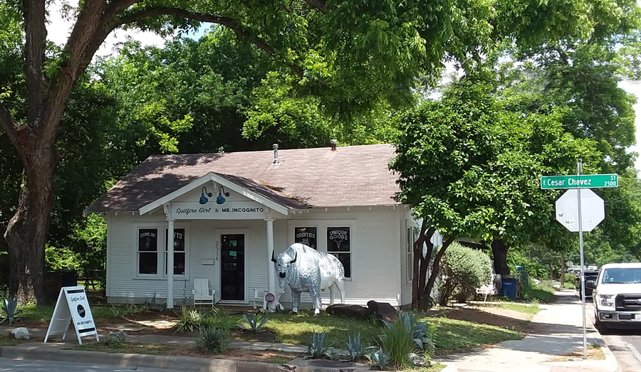 Here's a sample of the sites you'll see when you take a 30-minute walk on Cesar Chavez, near my apartment in southeast Austin. Spitfire Girl and Mr. Incognito sell oddities and unique goods in the white buffalo house.