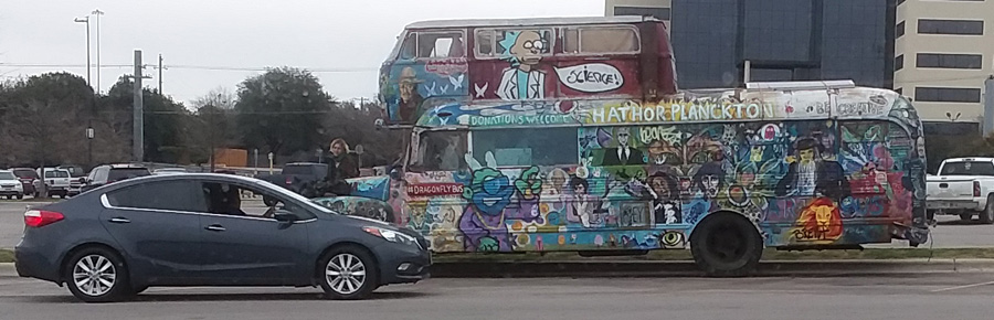 More proof that I now live in Keep Austin Weird, Texas. This hybrid vehicle loomed over all else in a strip shopping center in south Austin.