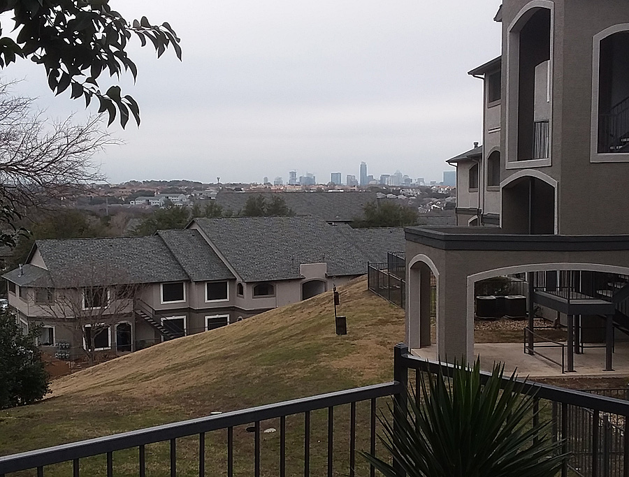 I moved into an apartment in southeast Austin in late January. This is not my apartment view, but it is the view from the patio by the pool. I see it everyday when I pick up mail.