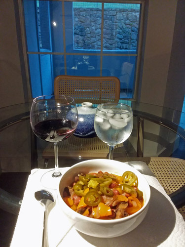 In spite of the diversity and quality of foody spots all over Austin, I don't eat out much. At this point, I would rather cook for myself. This dinner was brown rice, beans, peppers and wine. The iced drink is water. Honest.