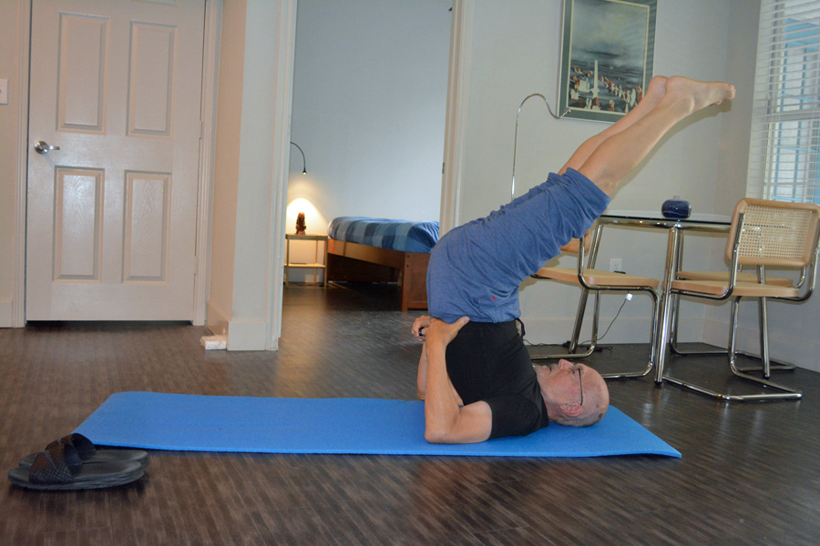 No, this photo is not photoshopped. A friend is helping me learn yoga. So far, so good. The hardest part of this shoulder stand was pointing the wireless shutter release toward the camera while in that position. (Note the small black object under my right thumb.)