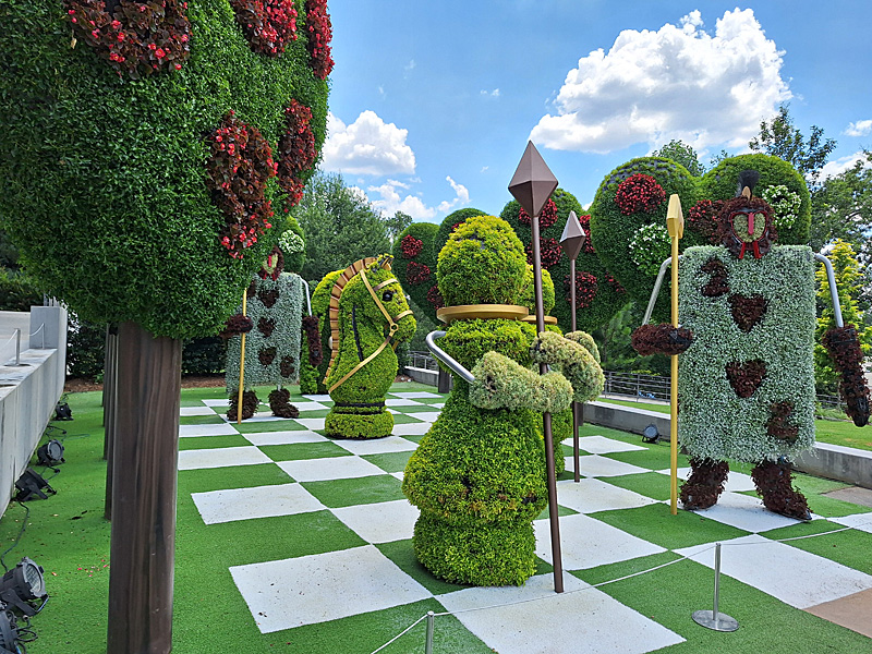 In the Atlanta Botanical Garden, I saw larger-than-life examples of mosaiculture, the art of using many living plants to create an artistic shape. These cards, chessmen, and all the other displays were based on Alice's experiences in Wonderland.