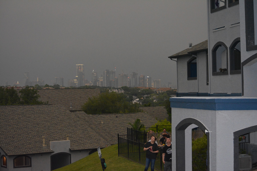 I turned on an app that identified songs of 15 confused birds before the eclipse. At totality, I turned to face downtown Austin. Eerie. Bonus: One of the watchers below wore a T-shirt I like. It said, "I survived SNOVID 2021".