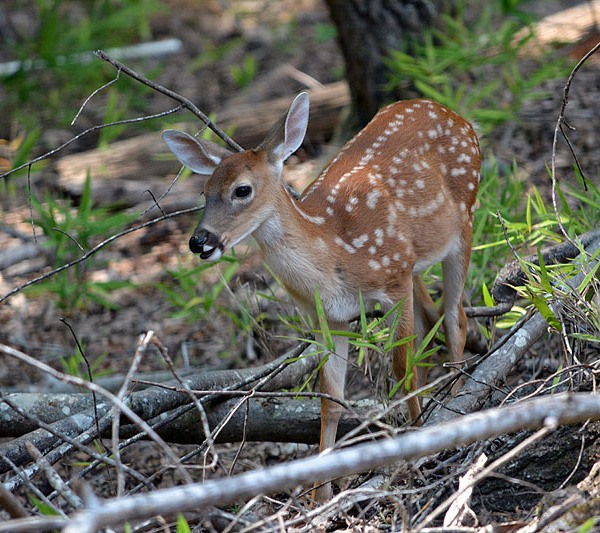Vacationing in Georgia for two weeks, I visited a friend whose home has a great view of wildlife. This faun foraged downhill from the patio, only about 20 yards away.