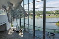 As I walked west toward downtown, the character of the shoreline changed. Boardwalks curve out into the lake. The lime-green object on the right side of this pier is a hammock. A resting hiker, I think, not a homeless person.
