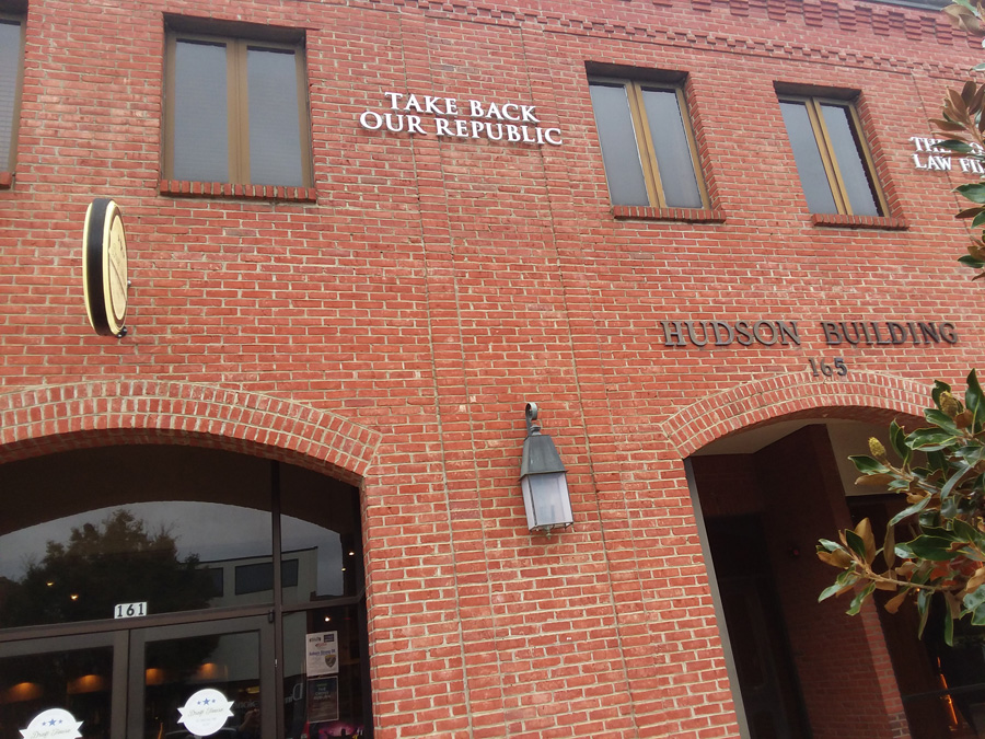 On my way to NC, I stopped in Auburn, Alabama, where I saw this sentiment on a professional building across from the university. Could it mean to take The Republic back from the demagogue-in-chief?