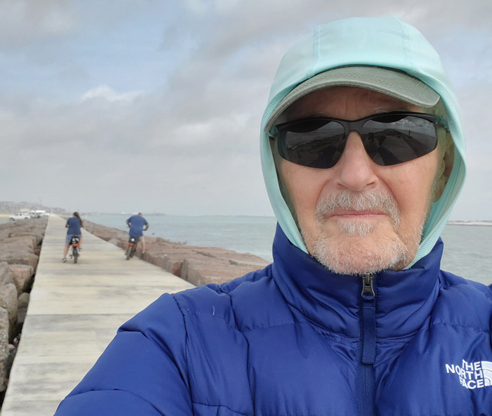 Don't let those two bikers' shorts fool you. It was cold on the Port Aransas jetty this gray March morning.