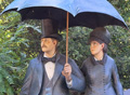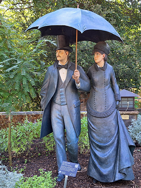 Lifelike sculptures strolled and danced in the Fort Worth Botanic Garden when I visited in June. This couple was transported from a painting by Impressionist artist Gustave Callebotte, Paris Street: A Rainy Day.