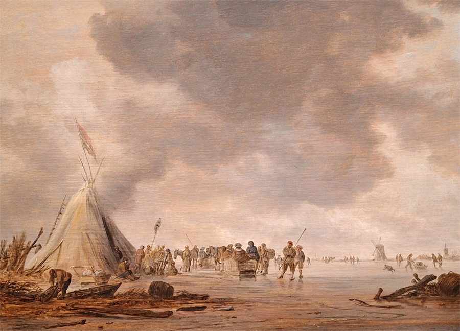 I saw A Frozen River with Skaters, 1637, by Dutch artist Jan van Goyen at the High in Atlanta. Nothing remarkable here except the "refreshment tent." I would call it a teepee, and I was surprised to see it in 17th Century Holland.