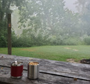 Breakfast at Roaring River. Even in Missouri this cool, foggy morning turned into a steam bath of an afternoon with a 110-degree heat index. I moved from the campground to the air-conditioned lodge.
